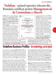 operatori | Vodafone Vodafone Management-ul de Continuitate a Afacerii Vodafone devine una dintre primele com pa - audit complet, desfășurat de către KPMG nii din România și primul operator telecom Audit Plc. Vodafone a fost prima companie din țară care primește certificarea pentru din România certificată potrivit standardului Management-ul de Continuitate a Afacerii ISO 27001, cu 9 ani în urmă, reușind să îl (BCM), conform standardului ISO 22301, mențină în toată această perioadă. de către Lloyd’s Register Quality Assurance Certificarea ISO 27001 pentru Manage - (LRQA), demonstrând capacitatea de recu - ment-ul Securității Informațiilor confirmă că perare și continuitate a operațiunilor sale, în Vodafone a definit și implementat procese situații neprevăzute. eficiente de securitatea informațiilor și că Certificarea BCM este aplicabilă design-ului, acestea sunt actualizate permanent, pentru management-ului și continuității (vânzări și susținerea eficientă a serviciilor oferite utili - suport) pentru produsele și serviciile de co - zatorilor săi, anunţă oficialii companiei. mu nicații electronice, terestre și mobile, de Certificarea include întreaga infrastructură 13 voce și date, oferite de Vodafone România fizică din București, ce deservește diviziile de cli enților săi de pe teritoriul țării. Certificarea consumer și business, departamentele finan - avizează toate zonele de operațiuni, din sediul ciar, relații cu clienții, resurse umane, juridic central și birourile Vodafone din București, și sisteme de facturare. clădirile de call-center, precum și alte hub-uri De asemenea, LRQA a mai certificat Voda - de rețea din țară. Certificarea a fost acordată fone România pentru Management-ul în urma unui audit extins, care a avut loc în Calității cu ISO 9001 și Management-ul februarie și martie 2014. Alte patru opera ți - Standardelor de Mediu ISO 14001. uni Vodafone, din Marea Britanie, Grecia, Germania și Turcia, au În zona de rețea, Vodafone a fost recunoscută, de 5 ori, drept cea obținut, de asemenea, certificarea BCM ISO 22301. mai performantă rețea de date mobile dintre toate rețelele GSM/ - Totodată, Vodafone a fost re-certificată cu standardul ISO 27001 UMTS/ CDMA din România, de către auditorul german indepen - pentru Management-ul Securității Informațiilor, în urma unui dent p3 Communications, începând din anul 2011. Vodafone Business Profiles - în roaming, ca în țară Abonamentele pentru companii, Vodafone Business Profiles, au Totodată, când călătoriți în străinătate și folosiți unul dintre noile noi opțiuni și toate pachetele RED dispun acum de minute, me - pachete RED Extra (29 Euro/ lună), RED (45 Euro/ lună) și RED saje și trafic de date în roaming incluse. Astfle, fie că sunteți client Top (75 Euro/ lună), apelurile, nelimitate, primite în roaming, vor business Vodafone, nou sau cu vechime, dacă optați pentru orice fi gratuite, dacă vă aflați în una din cele 45 de țări enumerate. abonament RED veți avea și în roaming aceeași experiență de na - Mai mult, clienții companii care efectuează des convorbiri interna - vi gare online, cu trafic de date inclus în pachetele RED, valabil în țio nale primesc minutele naționale din pachetele White Smart și 45 de țări, ce pornește de la 250 MB pentru noul RED Start și White Top ce pot fi folosite și internațional, pe mobil, către desti - ajunge până la 2 GB cu noul pachet RED Top, anunţă Vodafone. nații din Europa. Dacă aveți deja un abonament RED Start (23 Euro/ lună) sau superior primiți și minute dedicate convorbirilor Pentru prima dată, minutele de roaming din pachetele RED internaționale, către orice destinație, conform oficialilor companiei. Business pot fi utilizate și pentru apeluri internaționale, efectuate din străinătate, din și către una din cele 45 de țări din Zona Prin - Vodafone a mai lansat și două abonamente noi, RED Start și ci pală și Extinsă de roaming (Austria, Belgia, Cehia, Franţa, Ger ma - White Top, primul oferind pentru 23 Euro/ lună, apeluri și SMS- nia, Grecia, Ungaria, Irlanda, Italia, Malta, Olanda, Portugalia, uri naționale nelimitate, 250 de minute internaționale și 400 de Spania, Elveţia, Marea Britanie; Albania, Australia, Bulgaria, Cro - minute în roaming, precum și 750 MB trafic de date național, ația, Cipru, Danemarca, Egipt, Estonia, Finlanda, Hong Kong, Is lan - alături de 250 MB trafic de date în roaming. Pachetul White Top da, India, Japonia, Letonia, Liechtenstein, Lituania, Luxem burg, oferă, pentru 20 Euro/lună, convorbiri și SMS-uri nelimitate în Malaezia, Noua Zeelandă, Norvegia, Polonia, Reunion, Sin ga pore, rețea, 300 de minute în orice rețea națio nală și către rețelele inter - Slovacia, Slovenia, Africa de Sud, Suedia, Qatar, Ghana şi Turcia). na țio nale fixe și mobile, și 750 MB trafic de date. aprilie - mai 2014, COMUNiC@Ții Mobile