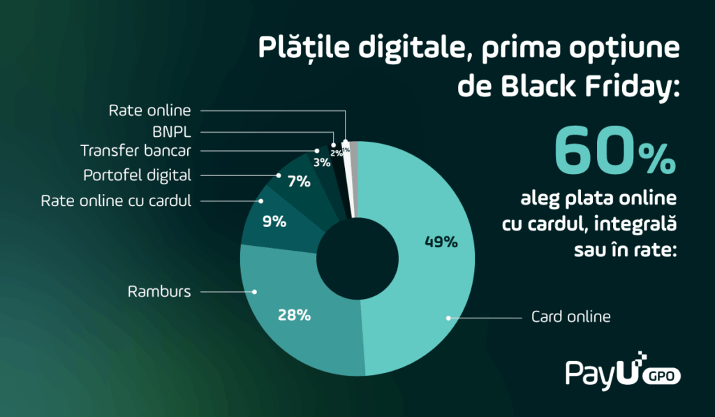 73% dintre români intenționează să cumpere anul acesta de Black Friday, potrivit unui studiu PayU GPO România, liderul plăților digitale din țară. Astfel, 49% dintre români declară că vor plăti online cu cardul, 9% intenționează să cumpere cu cardul, dar prin rate online, 7% aleg portofele digitale, iar 2% optează pentru soluții de tip Buy Now, Pay Later. Plata la livrare rămâne prezentă, însă scade ca pondere, fiind preferată de 28% dintre respondenți.