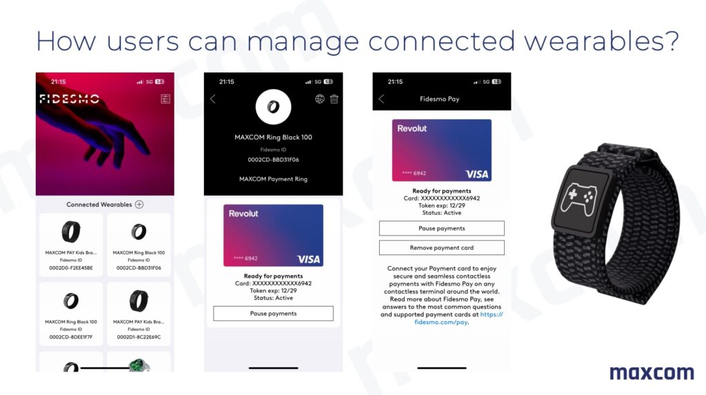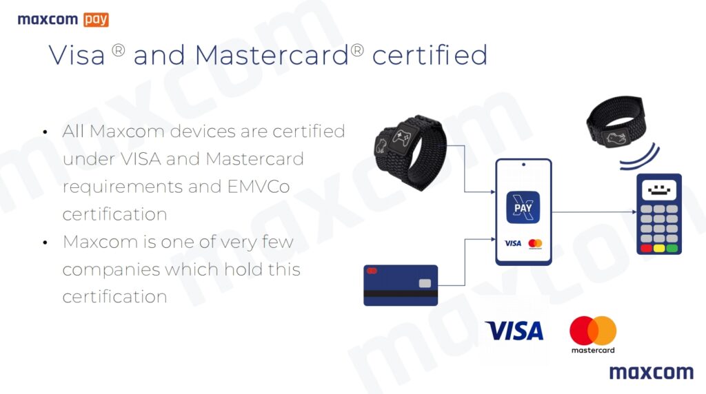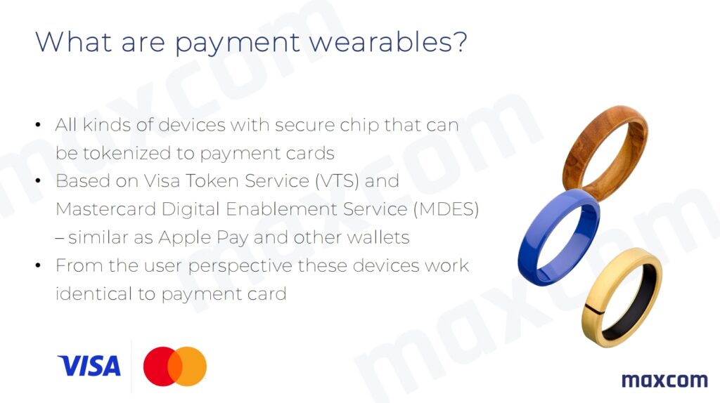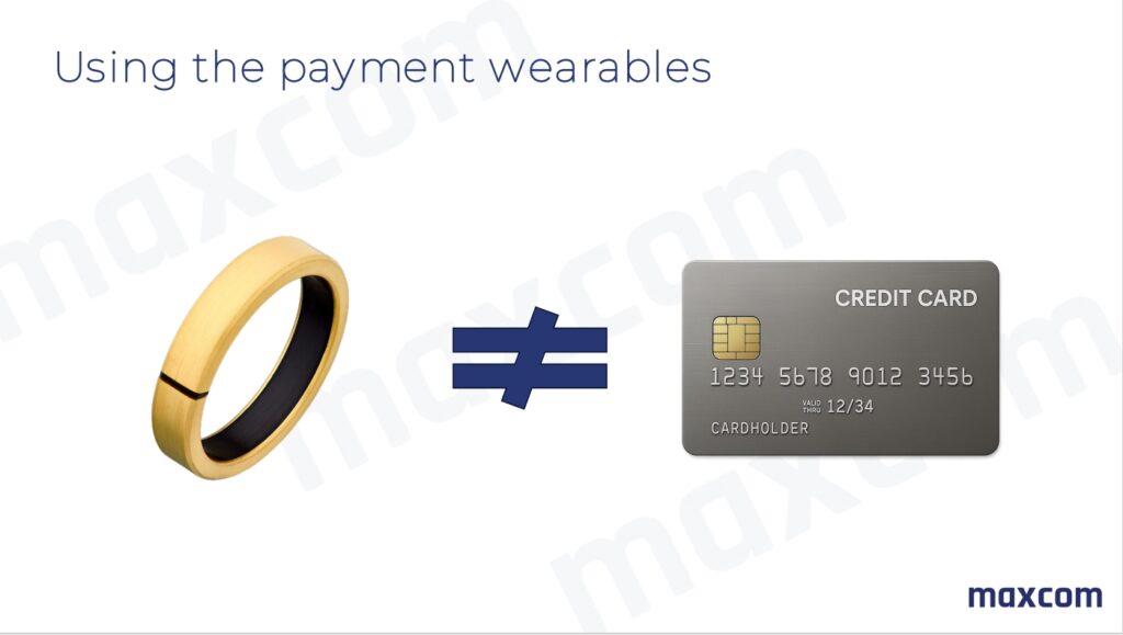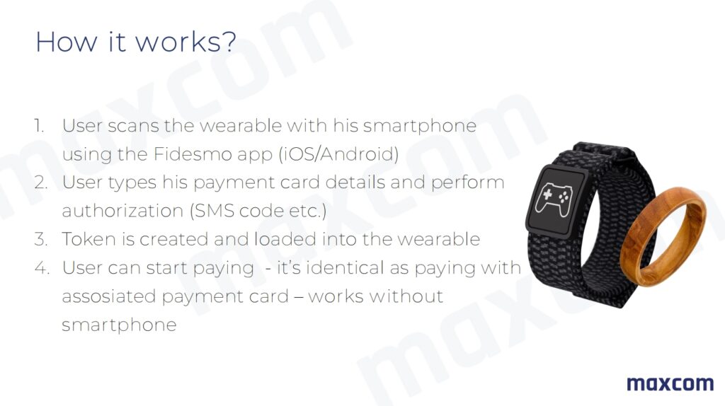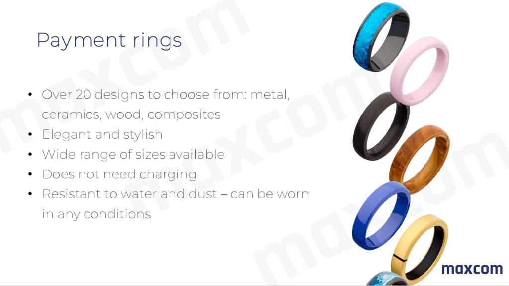 Dispozitivele de plată Maxcom sunt wearables pasive – inele sau brățări cu un cip securizat conectat la un card bancar. Nu necesită baterie, încărcare sau smartphone pentru plată.
