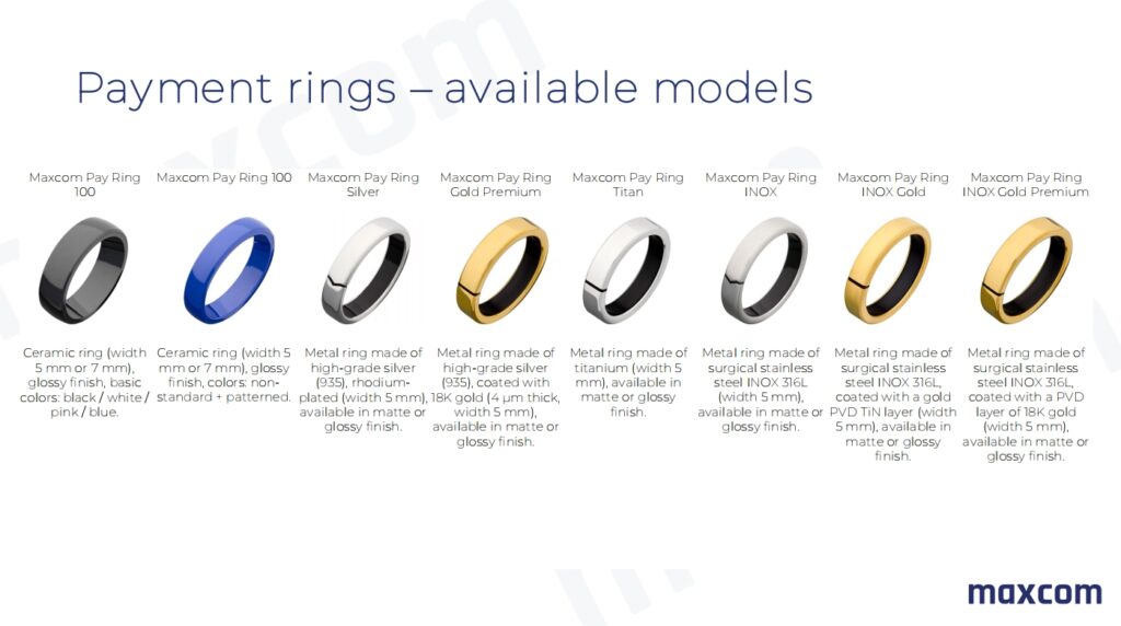 Inelul de plată Maxcom este conceput ca o bijuterie inteligentă: realizat din ceramică, oțel, titan, argint, chiar aur sau materiale compozite, el îmbină designul elegant cu securitatea digitală.