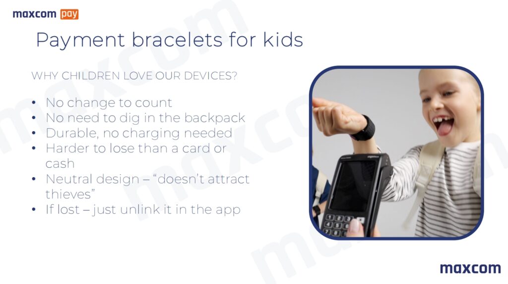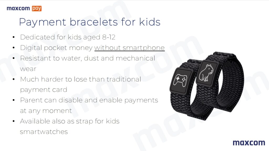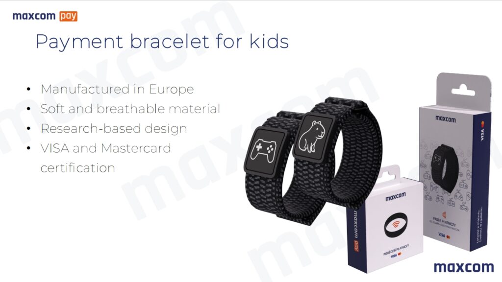 Maxcom a dezvoltat o gamă de brățări destinate copiilor între 8 și 12 ani, care le permit să efectueze plăți minore (mâncare la cantină, excursii, rechizite) fără telefon mobil.