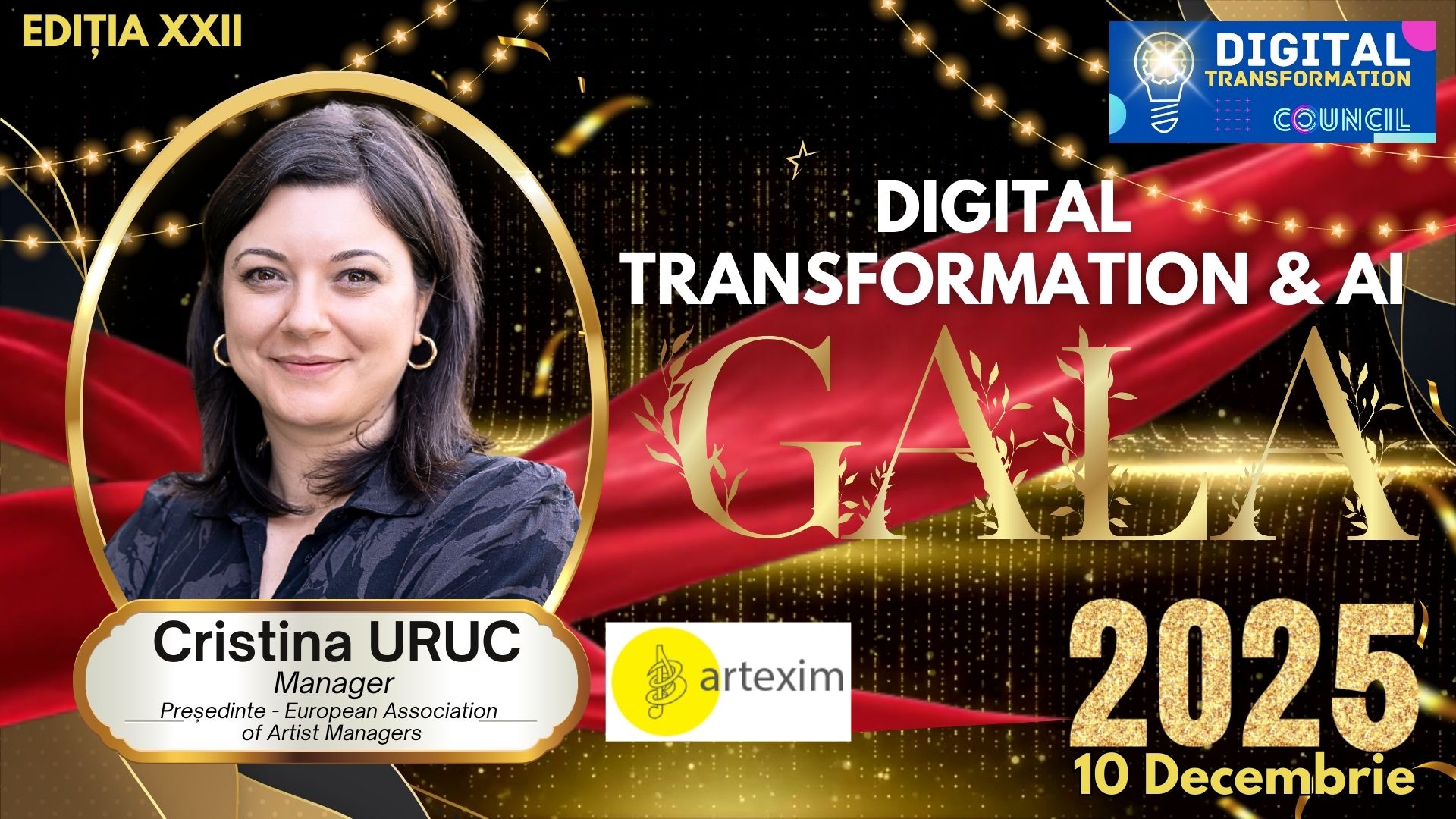Intervenția Cristinei Uruc, manager ARTEXIM, în cadrul celei de-a 22-a ediții a Galei Digital Transformation & AI, se înscrie firesc într-o discuție mai amplă despre sensul real al transformării digitale, dincolo de industriile tradițional asociate cu tehnologia. Discursul său pleacă de la o distincție conceptuală esențială, pe care Ion Vaciu – Digital Transformation Council o afirmă de fiecare dată public, deşi adesea aceasta ignorată în spațiul public: diferența dintre Digitizare, Digitalizare și Transformare Digitală. În această grilă, artele performative și managementul cultural nu sunt un apendice decorativ al transformării digitale, ci un teritoriu strategic, în care miza nu este eficiența operațională, ci relevanța culturală și capacitatea de a crea experiențe contemporane.