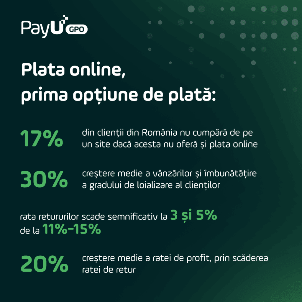 „Vedem o piață care în continuare are potențial de creștere, unde comercianții au în față oportunități clare. În primul rând, oferirea plății online ca opțiune principală este obligatorie: studiile arată că aproape 17% dintre clienți nu finalizează o achiziție dacă nu pot plăti online. În plus, integrarea plăților digitale aduce o creștere medie a vânzărilor de 30%, scade rata de retur de la 11–15% la 3–5% și duce la o majorare a profitului de aproximativ 20%. În al doilea rând, portofelele digitale precum Apple Pay și Google Pay cresc atât rata de conversie, cu până la 10%, cât și loializarea clienților, cu peste 7%”, punctează Elena Gheorghe, Country Manager PayU GPO România și Ungaria.