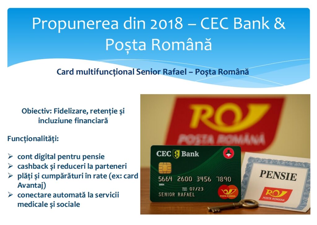 Proiectul, inițiat în 2018, a pornit de la ideea unui card bancar dedicat seniorilor, dezvoltat în parteneriat cu Poșta Română și CEC Bank, dar extins ulterior într-un ecosistem digital complet, care combină: