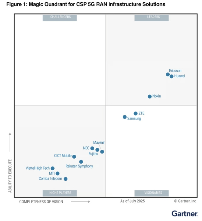 Compania suedeză Ericsson a fost recunoscută drept lider în graficul Gartner Magic Quadrant 2025 pentru soluții de infrastructură CSP 5G RAN, cu cea mai înaltă poziție pe axa Ability to Execute (Capacitatea de execuție).