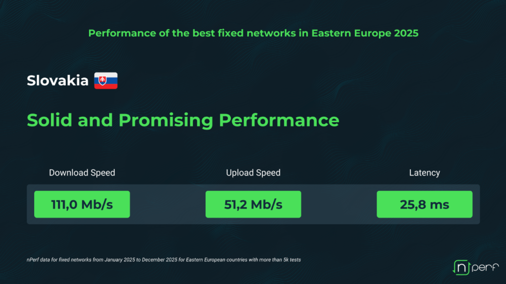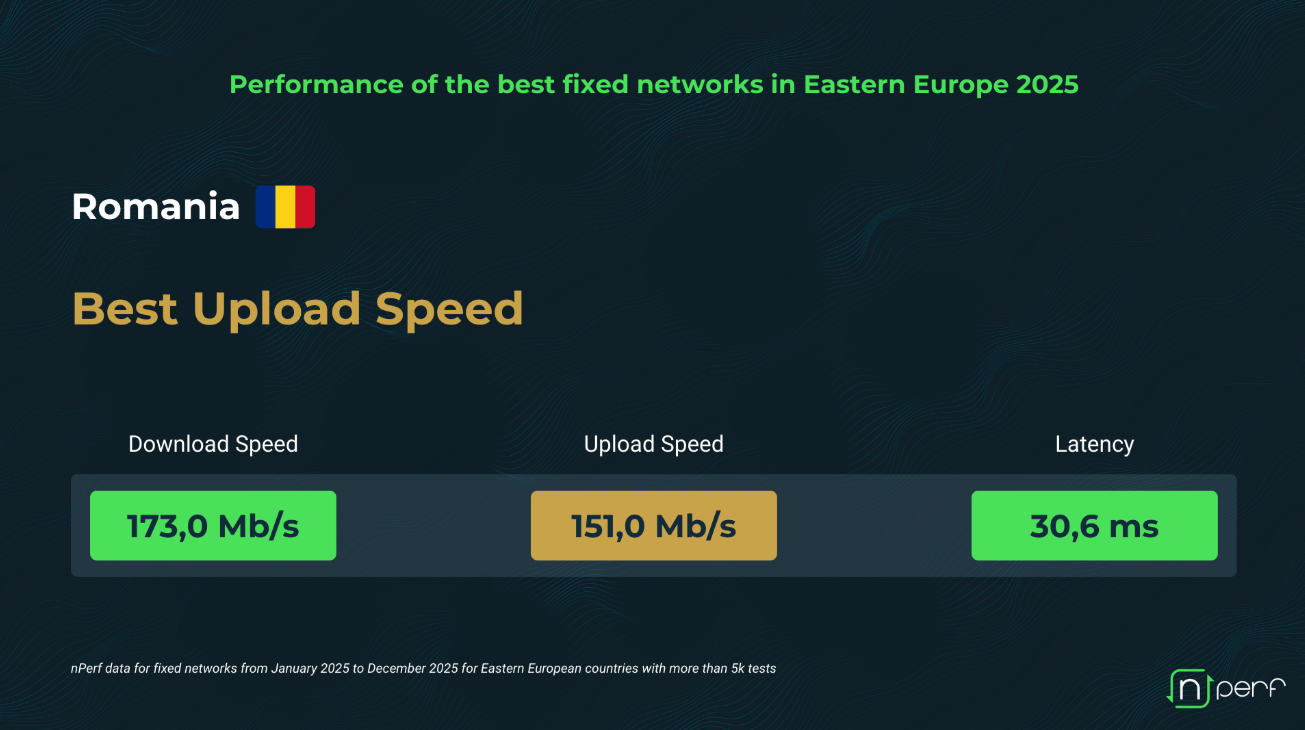 Conform raportului nPerf 2025, România înregistrează 173 Mbps viteză medie download, 151 Mbps viteză medie upload (cea mai ridicată din Europa de Est) și 30,6 ms latență medie.