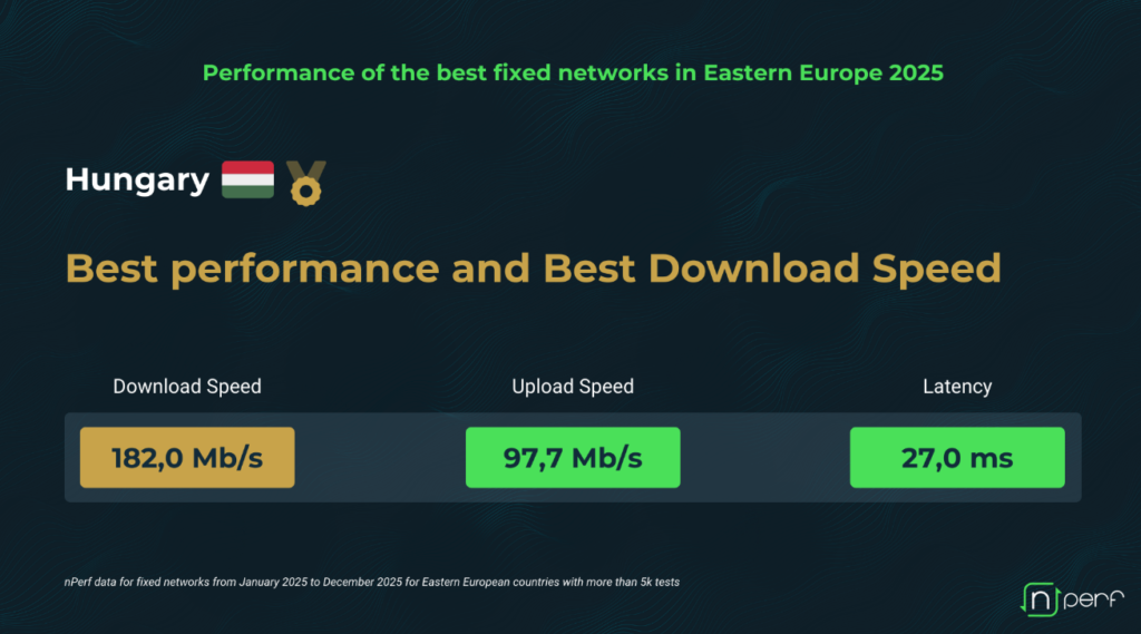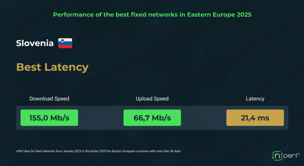 În paralel Ungaria conduce la download cu 182 Mbps, Slovenia are cea mai redusă latență din regiune: 21,4 ms, iar Moldova atinge viteze apropiate de top datorită unei penetrări FTTH de peste 90%. Diferențele sunt mici la download, dar semnificative la latență.