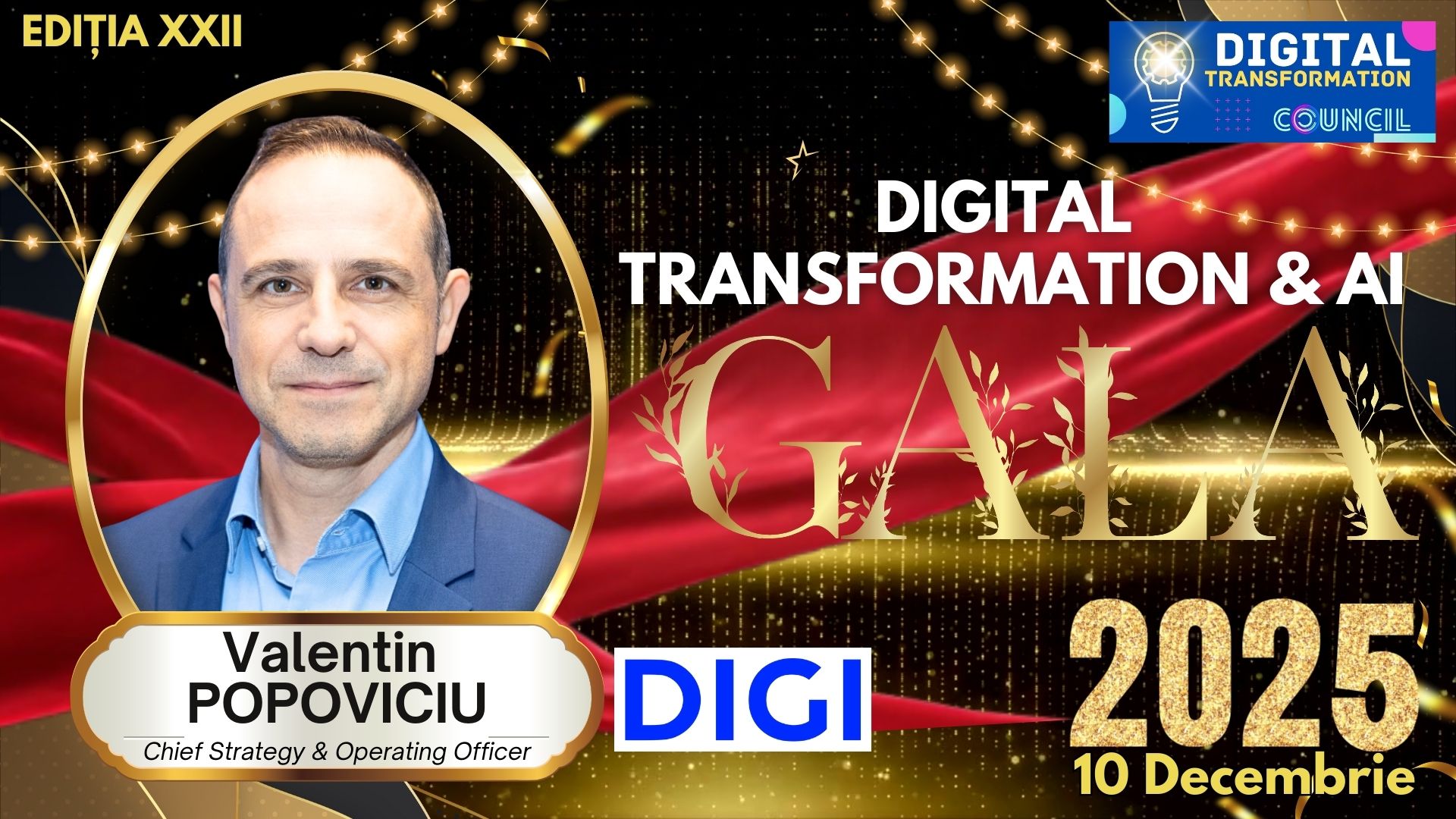 Valentin POPOVICIU, Chief Strategy & Operating Officer – DIGI @ GALA DIGITAL TRANSFORMATION & AI 2025 organizată de Digital Transformation Council pe 10 decembrie 2025, powered by COMUNICAȚII Mobile și moderată de Ion Vaciu și Roxana Onea.